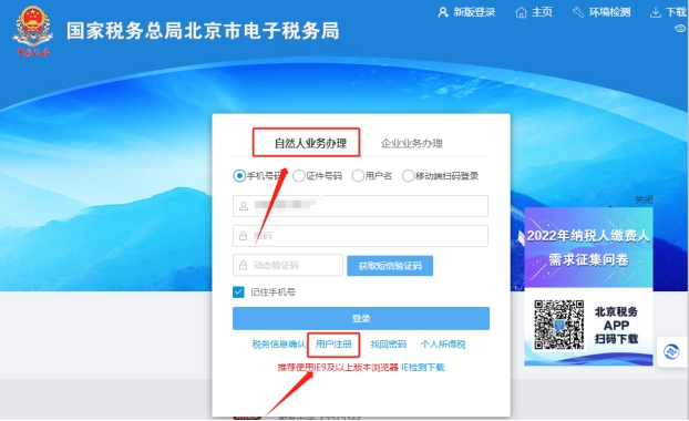 一、點擊北京市電子稅務局自然人業務辦理——點擊用戶注冊,完成個人賬戶注冊,注冊成功后登錄自然人業務辦理進入后按照提示做實名認證。