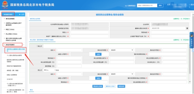 首先被投資企業登錄北京市電子稅務局備案(填寫兩張表)路徑:請您點擊【我要辦稅】—【其他服務事項】—【其他涉稅事項】—【被投資企業董事會/股東會報告和個人股東/股權變動報告】;