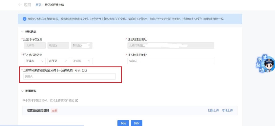 系統初始化功能界面,預填遷出地信息,手動補錄遷入地省級(計劃單列市級)、市級、區級行政區劃以及遷入地注冊地址、遷入地街道、遷移前尚未彌補的經營所得個人所得稅累計虧損(元)等數據項信息,并上傳已變更的外省市營業執照,點擊【預檢】。