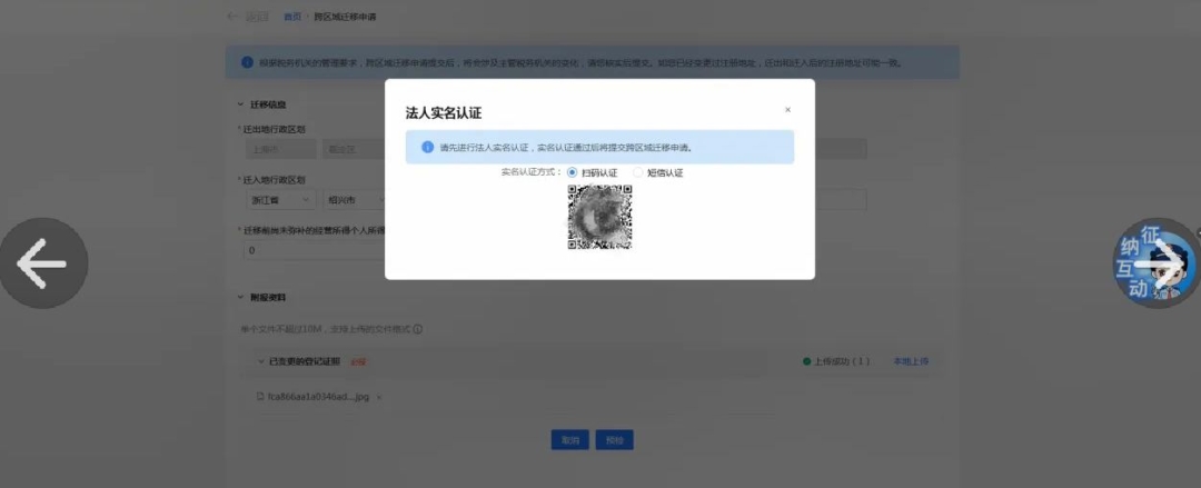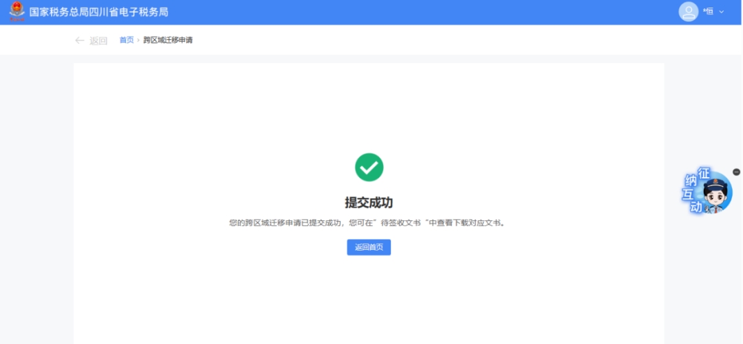 (2)當自動審核關閉時,系統提示“您的跨區域遷移申請已提交成功,請耐心等待稅務機關的處理結果”。