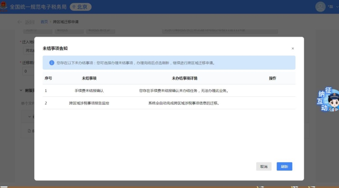 點擊預檢后系統自動彈出未辦結事項監控,分為“提示監控”和“強制監控”。對于“提示監控”可暫不辦理,對于“強制監控”您可按照頁面提示通過網上申請或聯系主管稅務機關辦結相關事項。辦結后刷新即可。